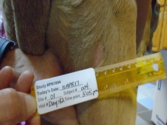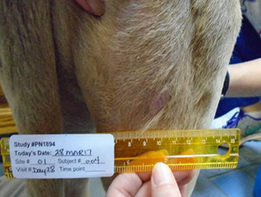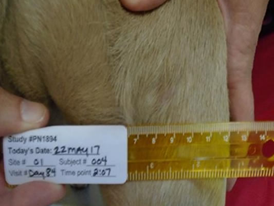 Acute inflammatory response with swelling and erythema to the tumour margins and immediate surrounding tissueMelo SR, et al. Veterinary Cancer Society, Houston, Texas, USA.